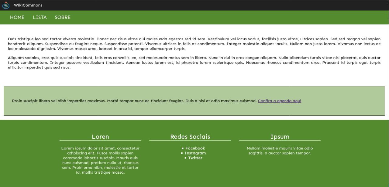 - Inicie listando os elementos comuns que você deve ter em todas as páginas, como um menu de navegação e um rodapé. A definição do layout deve levar em consideração o propósito do site. É interessante realizar pesquisas para coletar ideias para a posterior implementação (Exemplo).